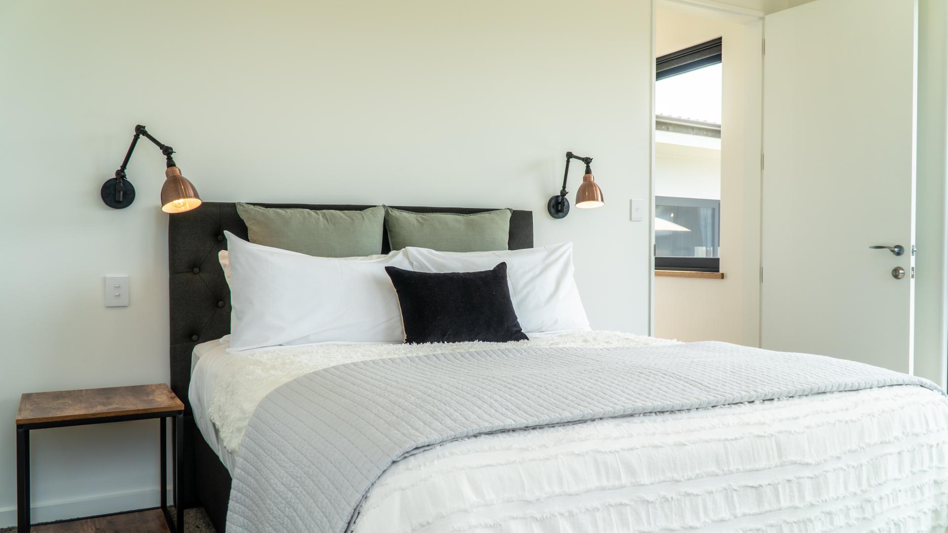 The large, contemporary kitchen in the open plan living area has sliding windows which open up completely to the view, as does the living room with balcony. The interior is modern and stylish, with curved wall edges, unique light fittings and beautiful furnishings. The four bedrooms are spacious and bright and the three bathrooms all offer their own individual style with custom made vanities and funky tiles. This holiday home is warm and welcoming and the perfect place to retreat to after a busy day exploring the amazing Wānaka region.